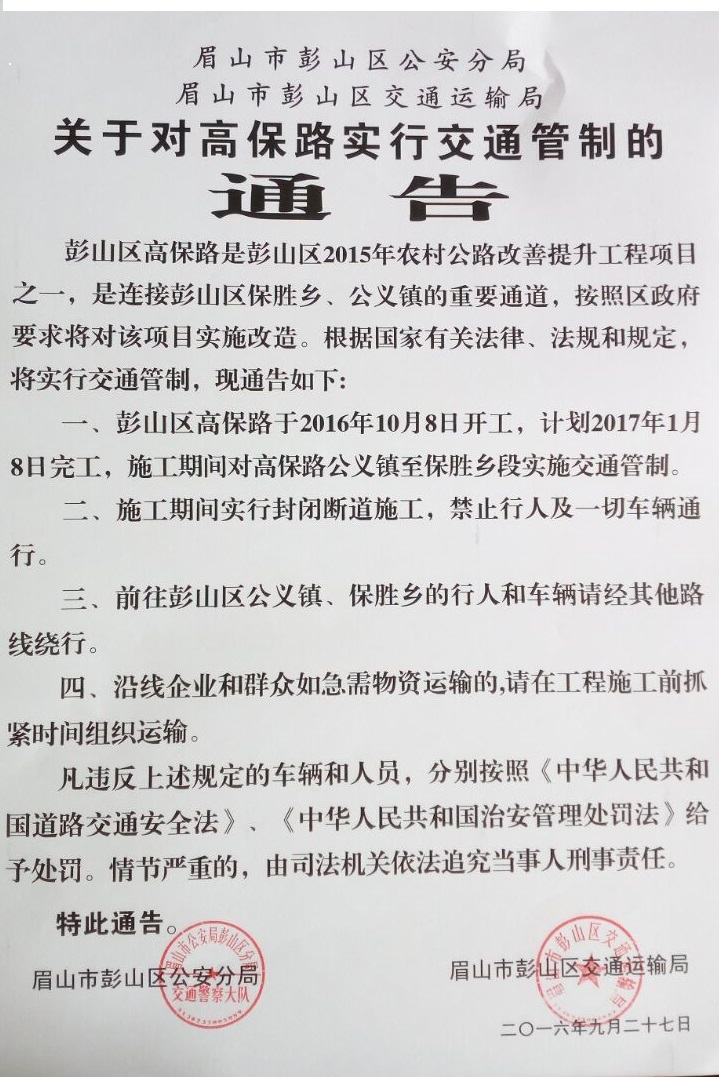 高保路实行交通管制的通告